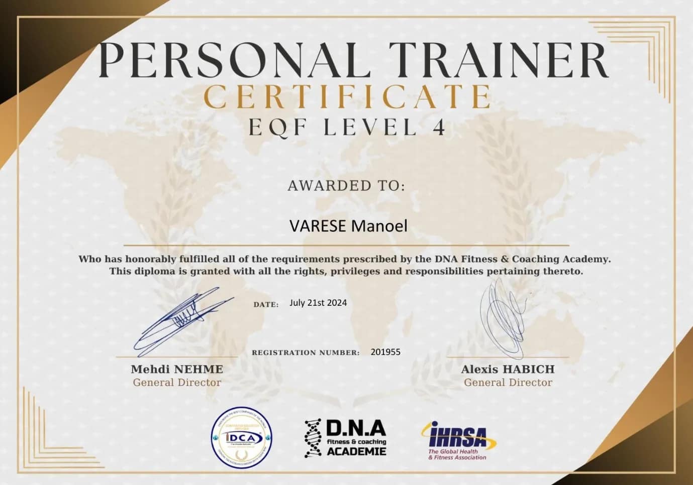Un Personal Trainer est un professionnel du sport qui aide des personnes à développer et maintenir une discipline et une rigueur dans la pratique du sport. Il est fortement conseillé d’être suivi par un Personal Trainer certifié et avec un registre de commerce en ordre (voici le mien: Manoel Varese – TVA: BE). Dans certains cas, le Personal Trainer dispose de certifications complémentaires. En ce qui me concerne, je suis aussi certifié en nutrition sportive. Mes certifications ont été émises par la DNA Académie.